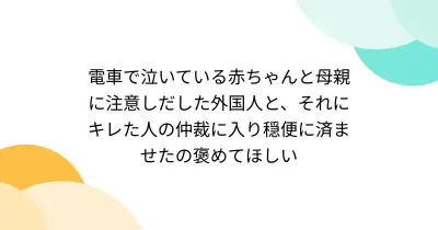 電車で泣いている赤ちゃんと母親に注意しだした外国人と、それにキレた人の仲裁に入り穏便に済ませたの褒めてほしい