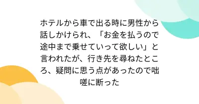 ホテルから車で出る時に男性から話しかけられ、「お金を払うので途中まで乗せていって欲しい」と言われたが、行き先を尋ねたところ、疑問に思う点があったので咄嗟に断った
