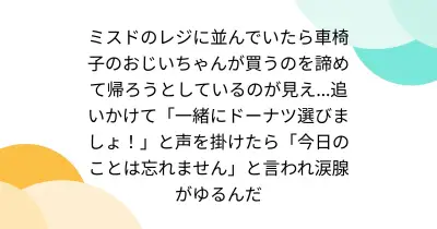 ミスドのレジに並んでいたら車椅子のおじいちゃんが買うのを諦めて帰ろうとしているのが見え...追いかけて「一緒にドーナツ選びましょ!」と声を掛けたら「今日のことは忘れません」と言われ涙腺がゆるんだ