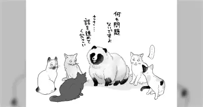 空き地に猫が数匹集まっていたので「猫会議かな〜?」と思ってみてみると、一匹はたぬきだった… 猫たちは「この丸いのなんなんだろう…」と言いたげな顔だった