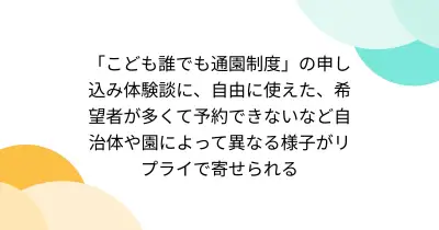 「こども誰でも通園制度」の申し込み体験談に、自由に使えた、希望者が多くて予約できないなど自治体や園によって異なる様子がリプライで寄せられる