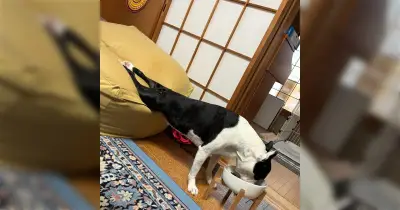 実家のいぬが新しい食べ方をしていた→「筋トレしてるみたい」「だらしないのかストイックなのか」