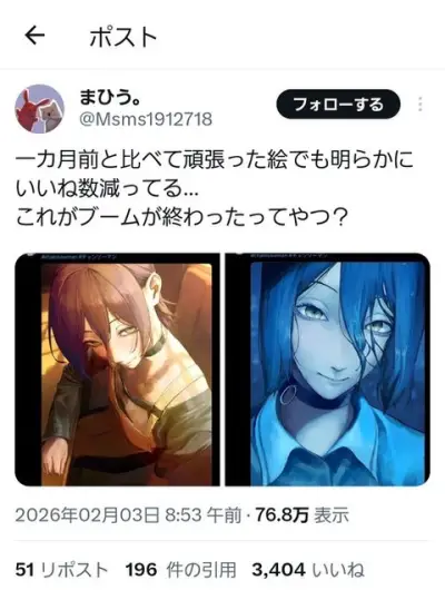 【悲報】チェンソーマン完全にブームが終わる、ファンアートのいいね数が10分の1に