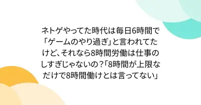 ネトゲやってた時代は毎日6時間で「ゲームのやり過ぎ」と言われてたけど、それなら8時間労働は仕事のしすぎじゃないの?「8時間が上限なだけで8時間働けとは言ってない」