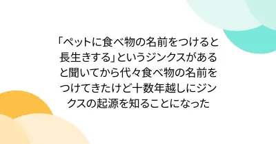 「ペットに食べ物の名前をつけると長生きする」というジンクスがあると聞いてから代々食べ物の名前をつけてきたけど十数年越しにジンクスの起源を知ることになった