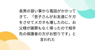 長男の習い事から電話がかかってきて、「息子さんがお友達にケガをさせてメガネも壊したのに、お父様が謝罪もなく帰ったので相手先の保護者の方がお怒りです」と言われた
