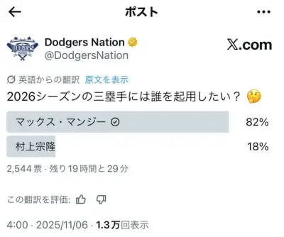 【悲報】大手ドジャースアカウント「マンシーと村上どっちを2026年の三塁手にしたい??」