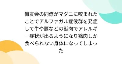 猟友会の同僚がマダニに咬まれたことでアルファガル症候群を発症して牛や豚などの獣肉でアレルギー症状が出るようになり鶏肉しか食べられない身体になってしまった