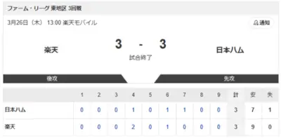 【vs.楽天 東地区 3回戦】3-3で引き分け