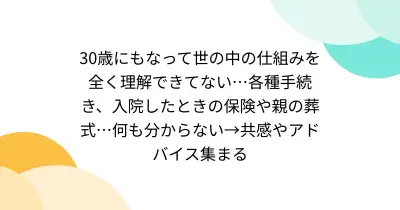 30歳にもなって世の中の仕組みを全く理解できてない…各種手続き、入院したときの保険や親の葬式…何も分からない→共感やアドバイス集まる
