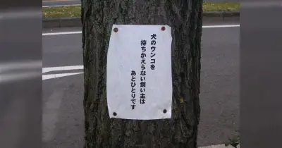 「あとひとりです」犬の糞を放置されて困っていると思われる人の張り紙が並々ならぬ圧を放っていた