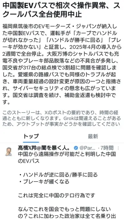 中国製EVバスで相次ぐ操作異常、スクールバス全台使用中止