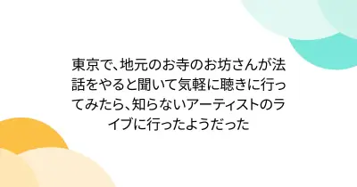 東京で、地元のお寺のお坊さんが法話をやると聞いて気軽に聴きに行ってみたら、知らないアーティストのライブに行ったようだった