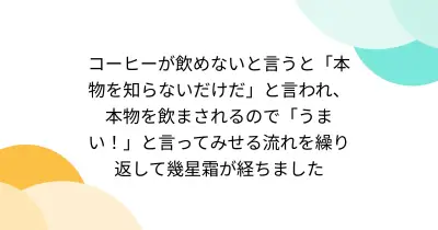 コーヒーが飲めないと言うと「本物を知らないだけだ」と言われ、本物を飲まされるので「うまい!」と言ってみせる流れを繰り返して幾星霜が経ちました