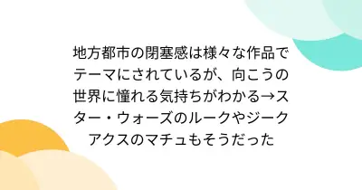 地方都市の閉塞感は様々な作品でテーマにされているが、向こうの世界に憧れる気持ちがわかる→スター・ウォーズのルークやジークアクスのマチュもそうだった