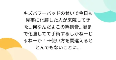 キズパワーパッドのせいで今日も見事に化膿した人が来院してきた...何なんだよこの絆創膏...腱まで化膿してて手術するしかねーじゃねーか!→使い方を間違えるととんでもないことに...