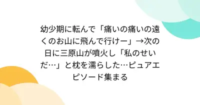 幼少期に転んで「痛いの痛いの遠くのお山に飛んで行けー」→次の日に三原山が噴火し「私のせいだ…」と枕を濡らした…ピュアエピソード集まる