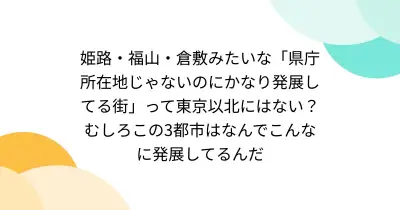 姫路・福山・倉敷みたいな「県庁所在地じゃないのにかなり発展してる街」って東京以北にはない?むしろこの3都市はなんでこんなに発展してるんだ