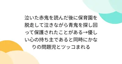 泣いた赤鬼を読んだ後に保育園を脱走して泣きながら青鬼を探し回って保護されたことがある→優しい心の持ち主であると同時にかなりの問題児とツッコまれる