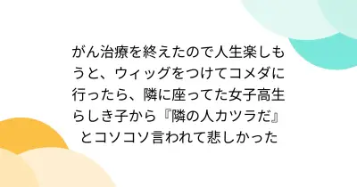 がん治療を終えたので人生楽しもうと、ウィッグをつけてコメダに行ったら、隣に座ってた女子高生らしき子から『隣の人カツラだ』とコソコソ言われて悲しかった