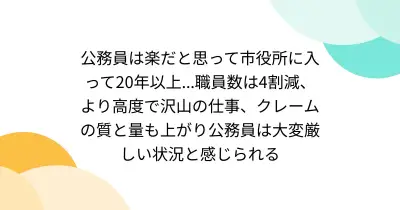 公務員は楽だと思って市役所に入って20年以上...職員数は4割減、より高度で沢山の仕事、クレームの質と量も上がり公務員は大変厳しい状況と感じられる