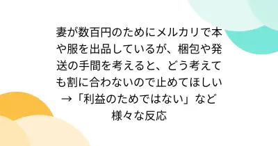 妻が数百円のためにメルカリで本や服を出品しているが、梱包や発送の手間を考えると、どう考えても割に合わないので止めてほしい→「利益のためではない」など様々な反応