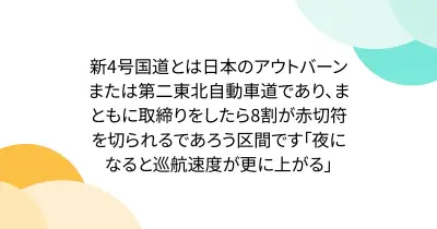 新4号国道とは日本のアウトバーンまたは第二東北自動車道であり、まともに取締りをしたら8割が赤切符を切られるであろう区間です「夜になると巡航速度が更に上がる」