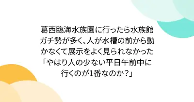 葛西臨海水族園に行ったら水族館ガチ勢が多く、人が水槽の前から動かなくて展示をよく見られなかった「やはり人の少ない平日午前中に行くのが1番なのか?」