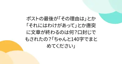 ポストの最後が「その理由は」とか「それにはわけがあって」とか唐突に文章が終わるのは何?口封じでもされたの?「ちゃんと140字でまとめてください」