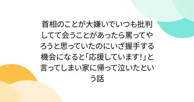 首相のことが大嫌いでいつも批判してて会うことがあったら罵ってやろうと思っていたのにいざ握手する機会になると「応援しています!」と言ってしまい家に帰って泣いたという話