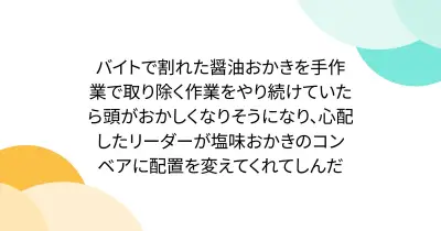 バイトで割れた醤油おかきを手作業で取り除く作業をやり続けていたら頭がおかしくなりそうになり、心配したリーダーが塩味おかきのコンベアに配置を変えてくれてしんだ