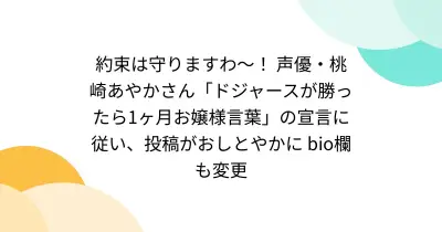 約束は守りますわ~! 声優・桃崎あやかさん「ドジャースが勝ったら1ヶ月お嬢様言葉」の宣言に従い、投稿がおしとやかに bio欄も変更