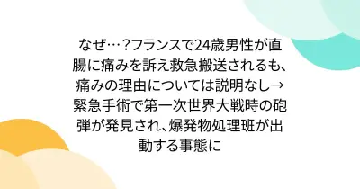 なぜ…?フランスで24歳男性が直腸に痛みを訴え救急搬送されるも、痛みの理由については説明なし→緊急手術で第一次世界大戦時の砲弾が発見され、爆発物処理班が出動する事態に