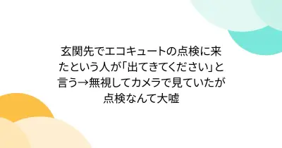 玄関先でエコキュートの点検に来たという人が「出てきてください」と言う→無視してカメラで見ていたが点検なんて大嘘