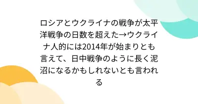 ロシアとウクライナの戦争が太平洋戦争の日数を超えた→ウクライナ人的には2014年が始まりとも言えて、日中戦争のように長く泥沼になるかもしれないとも言われる