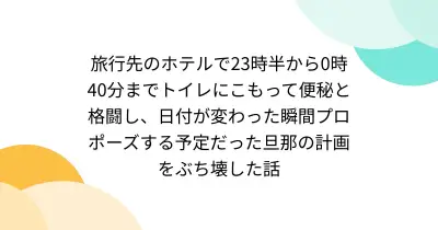 旅行先のホテルで23時半から0時40分までトイレにこもって便秘と格闘し、日付が変わった瞬間プロポーズする予定だった旦那の計画をぶち壊した話