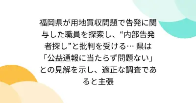 福岡県が用地買収問題で告発に関与した職員を探索し、“内部告発者探し”と批判を受ける… 県は「公益通報に当たらず問題ない」との見解を示し、適正な調査であると主張