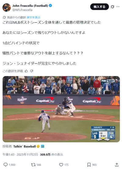 ブルージェイズファン「最終回のバントは史上最悪の采配」 ← 1万いいね