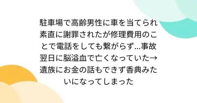 駐車場で高齢男性に車を当てられ素直に謝罪されたが修理費用のことで電話をしても繋がらず...事故翌日に脳溢血で亡くなっていた→遺族にお金の話もできず香典みたいになってしまった