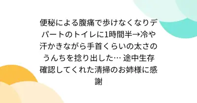 便秘による腹痛で歩けなくなりデパートのトイレに1時間半→冷や汗かきながら手首くらいの太さのうんちを捻り出した… 途中生存確認してくれた清掃のお姉様に感謝