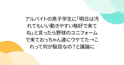アルバイトの男子学生に「明日は汚れてもいい動きやすい格好で来てね」と言ったら野球のユニフォームで来ておっちゃん達にウケてた→これって何が駄目なの?と議論に