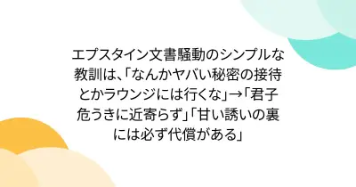 エプスタイン文書騒動のシンプルな教訓は、「なんかヤバい秘密の接待とかラウンジには行くな」→「君子危うきに近寄らず」「甘い誘いの裏には必ず代償がある」