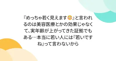 『めっちゃ若く見えます😳』と言われるのは美容医療とかの効果じゃなくて、実年齢が上がってきた証拠でもある…本当に若い人には『若いですね』って言わないから