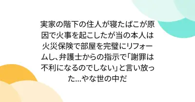 実家の階下の住人が寝たばこが原因で火事を起こしたが当の本人は火災保険で部屋を完璧にリフォームし、弁護士からの指示で「謝罪は不利になるのでしない」と言い放った...やな世の中だ