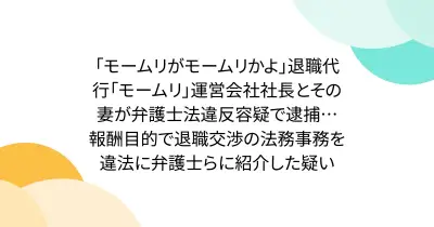 「モームリがモームリかよ」退職代行「モームリ」運営会社社長とその妻が弁護士法違反容疑で逮捕… 報酬目的で退職交渉の法務事務を違法に弁護士らに紹介した疑い