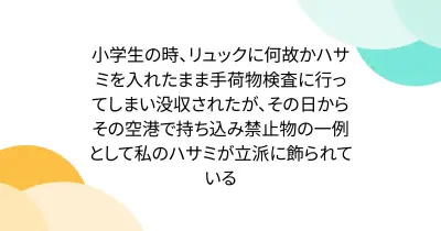小学生の時、リュックに何故かハサミを入れたまま手荷物検査に行ってしまい没収されたが、その日からその空港で持ち込み禁止物の一例として私のハサミが立派に飾られている