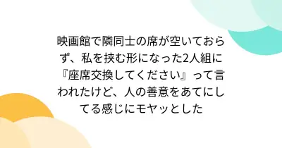 映画館で隣同士の席が空いておらず、私を挟む形になった2人組に『座席交換してください』って言われたけど、人の善意をあてにしてる感じにモヤッとした