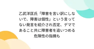 乙武洋匡氏「障害を言い訳にしないで、障害は個性」という言ってない発言を紹介され否定、デマであること共に障害者を追いつめる危険性の指摘も
