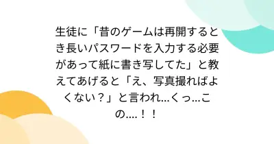 生徒に「昔のゲームは再開するとき長いパスワードを入力する必要があって紙に書き写してた」と教えてあげると「え、写真撮ればよくない?」と言われ...くっ...この....!!