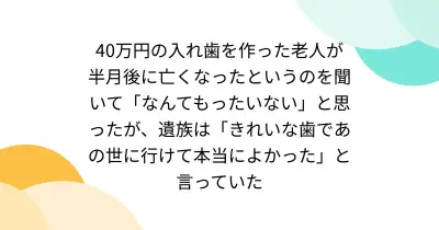 40万円の入れ歯を作った老人が半月後に亡くなったというのを聞いて「なんてもったいない」と思ったが、遺族は「きれいな歯であの世に行けて本当によかった」と言っていた